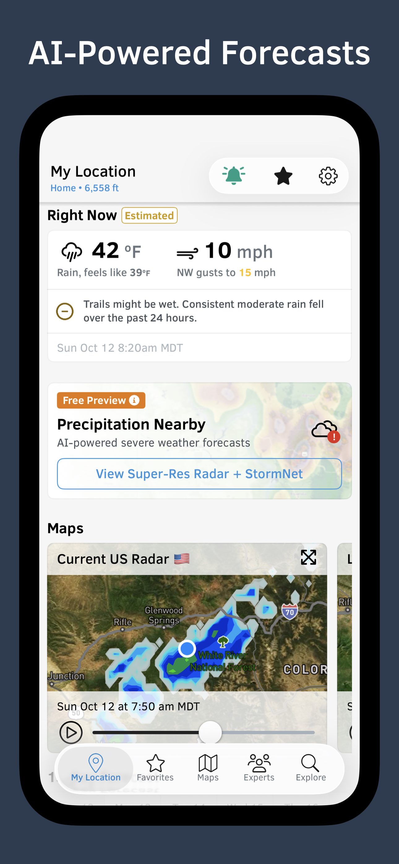 We make it easy to track incoming storms with high-resolution current and forecast global radar. You can also view and download 3D satellite maps for forecast snowfall, snow depth, avalanche risk, active fires, air quality, wildfire smoke, cloud cover, hail size, public and private land ownership, nearby weather stations, and more.