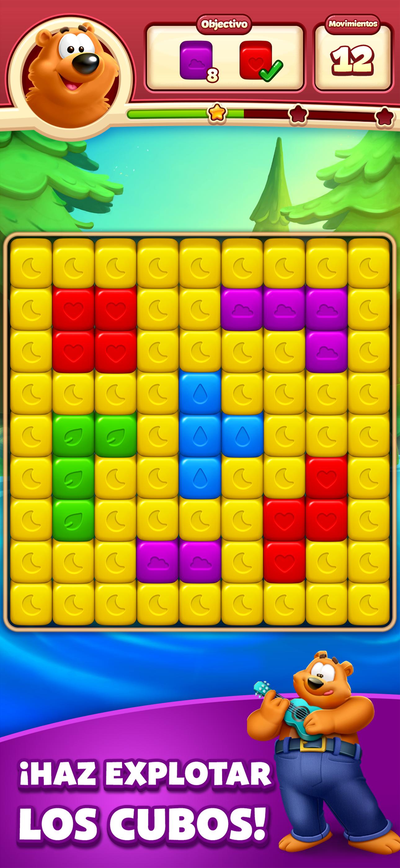 ¡Únete al caricaturesco mundo del gato Cooper , el lobo Wally y el oso Bruno, y disfruta de montones de niveles locos y desafiantes! Explota cubos y haz combos alucinantes para subir de nivel. Resuelve puzles para ayudar a los Toons a viajar por mundos mágicos.