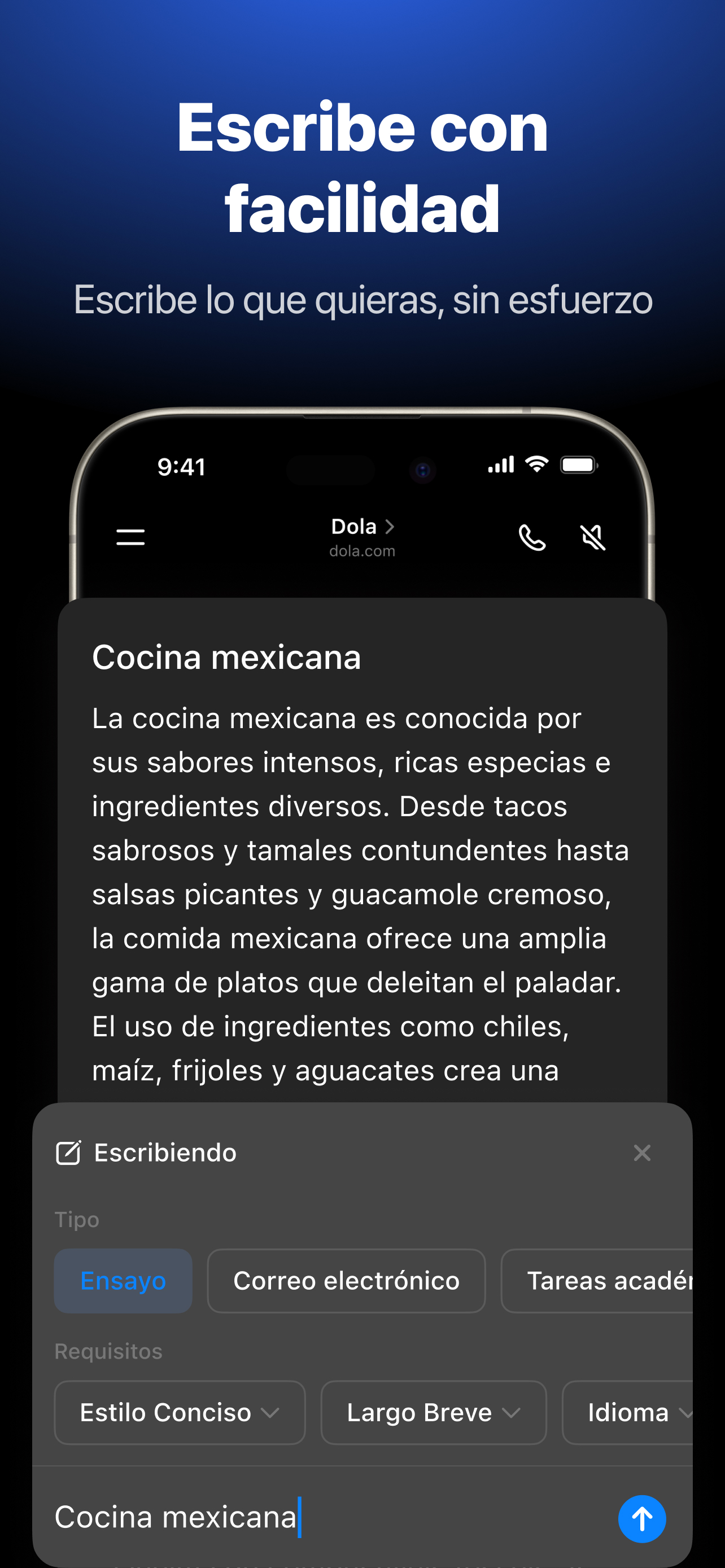 Dola puede ayudarte a escribir correos electrónicos, publicaciones en redes sociales, ensayos, currículums y más de forma rápida y clara. Si no sabes qué decir o quieres empezar de cero, envía un comando y deja que Dola se encargue del resto.