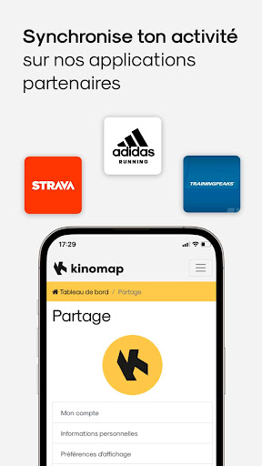 • Synchronisez vos activités Kinomap sur nos applications partenaires comme Strava ou adidas Running.