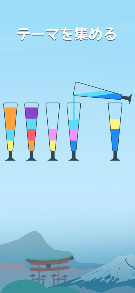 Water Sort Puzzle(ウォーターソートパズル)は楽しさと中毒性のあるパズルゲームです!グラスの中が同じ色の水になるまで並び替えよう。あなたの脳を鍛える挑戦的でありながらリラックスできるゲーム!