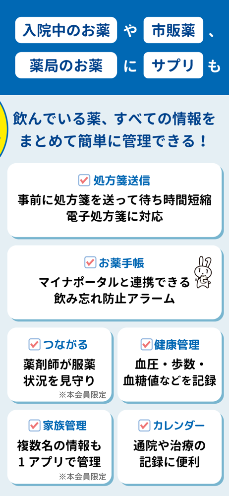 アプリの機能としては、登録用カードや手入力を必要とせずに、ご自身のお薬情報を自動的に登録することができる「自動反映」機能や、スマートフォンで撮影した処方箋情報を薬局へ送信できる「処方箋送信」機能、家族単位でのお薬管理ができる「家族管理」機能があり、従来の電子お薬手帳をさらに進化させたお薬手帳アプリです。
