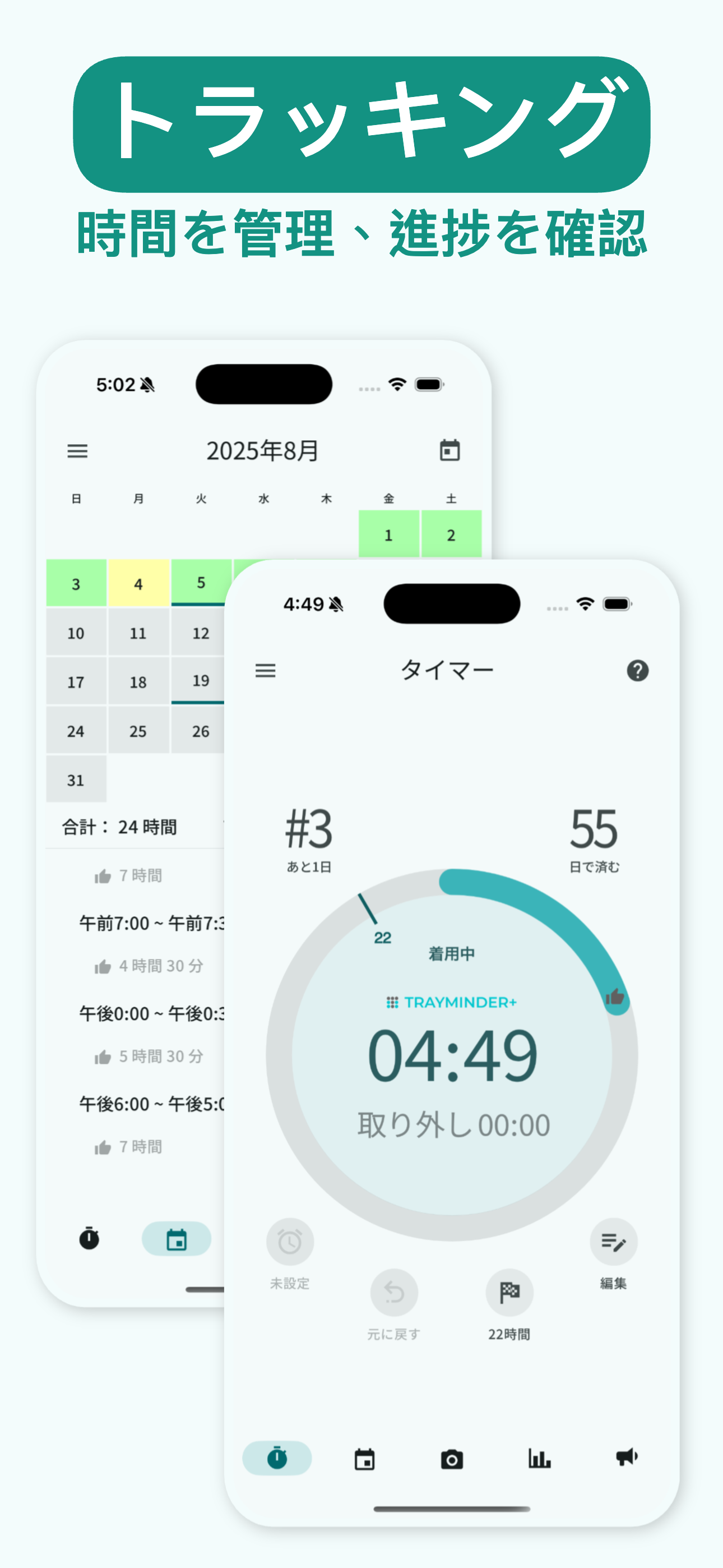 成功のカギは細部にあります:装着時間の追跡、スマートなリマインダー、毎日の継続。