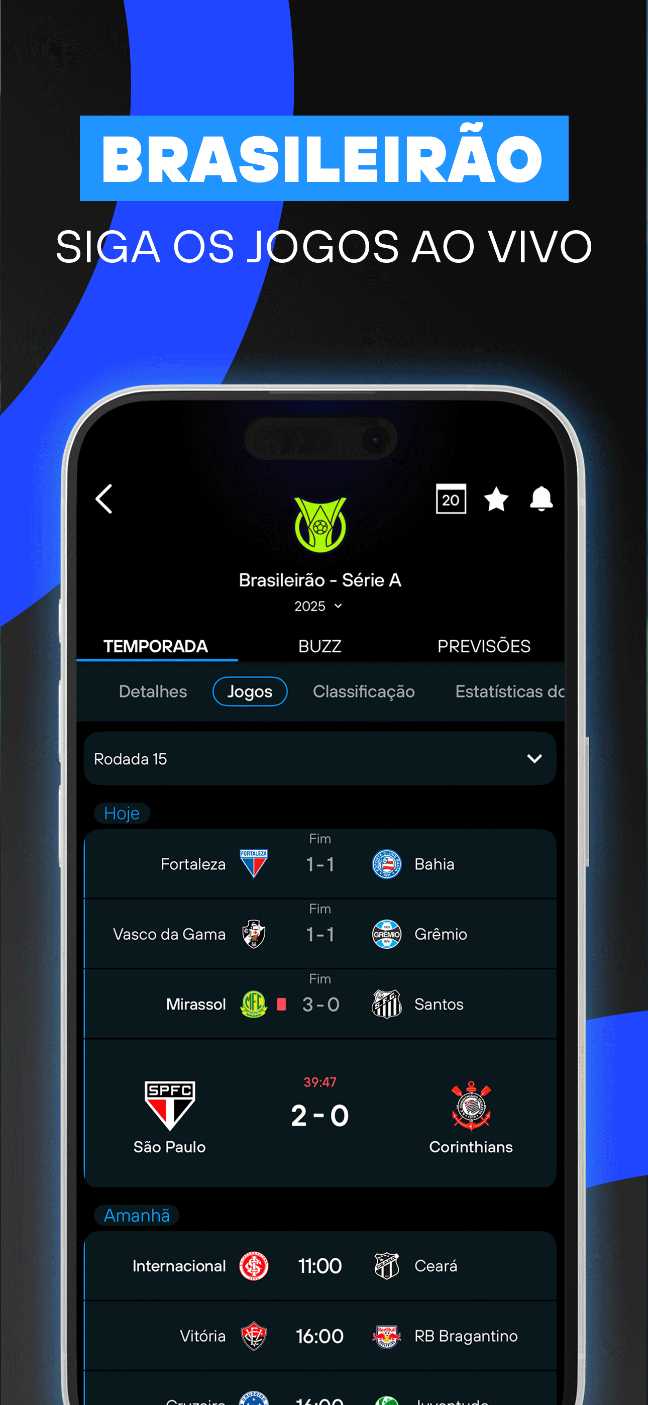Bola rolando no Brasileirão! É hora dos 20 times do Brasileirão Série A lutarem pelo campeonato mais disputado do mundo. Atlético-MG, Botafogo, Corinthians, Flamengo, Fluminense, Internacional, Palmeiras, Santos e outros grandes times vêm forte para a disputa em cada placar de futebol. Receba alerta de gols, agenda de jogos, notícias, tabela de classificação, escalações, estatísticas e mais. Brasileirão ao vivo e grátis é com o app 365Scores. Não perca os resultados dos jogos em andamento e consulte os jogos de hoje. Além do Brasileirão Série A, Série B, Série C e Série D, o app 365Scores traz todos os detalhes da Premier League, La Liga, Ligue 1, Bundesliga, e claro, a disputadíssima Champions.